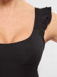 Dieser einteilige Badeanzug, ein typisches Stück der Reihe Glam, besticht durch seinen strukturierten, femininen Look. Sein abgerundetes Dekolleté bringt die Brust auf subtile Weise zur Geltung und die kleinen Rüschen auf den Schultern hauchen ihm eine romantische, trendige Note ein. Eine elegante Kreation, die so konzipiert ist, dass sie Komfort, Halt und Bewegungsfreiheit miteinander vereint.