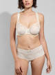 Een cup zonder naad, die op perfecte wijze ondoorzichtigheid combineert met transparant kant dat speciaal is ontworpen voor deze naadloze beha met naadloze cups. De bandjes van de klassieke, onzichtbare beugelbeha Melody zijn gemaakt van schuim overtrokken met tricot satijn, voor maximaal comfort en uitstraling. Het decolleté wordt benadrukt door een dun randje van satijn voor nog meer comfort en verfijning, terwijl de versiering middenvoor, een combinatie van mousseline en satijn, de pracht van deze collectie onderstreept.